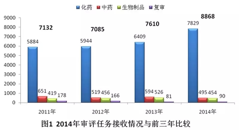 2014年,药审中心接收新的注册申请8868(以受理号计,下同)。与既往年度接收注册申请的比较情况见图1