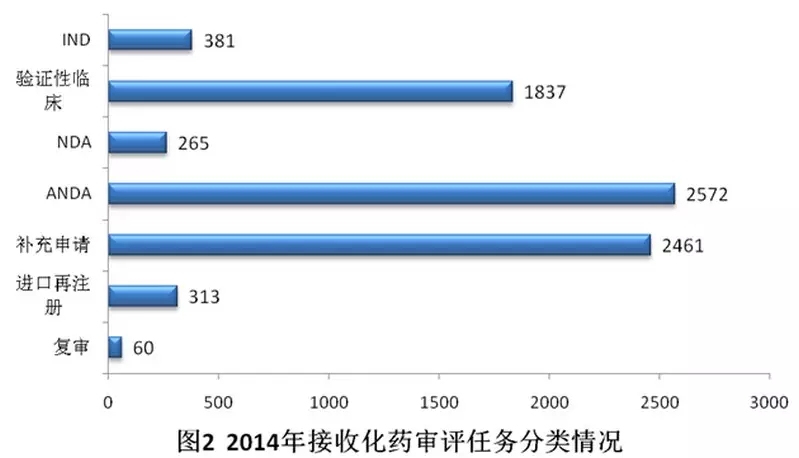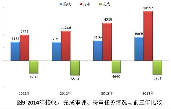 2014年,药审中心共完成5261个注册申请的技术审评,比2013年的审评完成量增加了12.9%,但接收任务量较2013年增加了16.5%,待审任务积压量进一步增加。2014年接收、完成审评、待审任务情况与前三年比较见图9