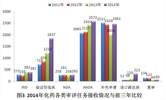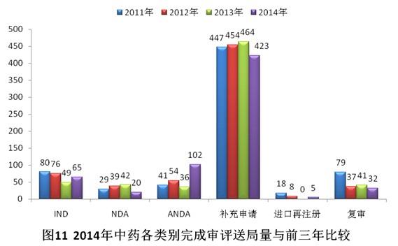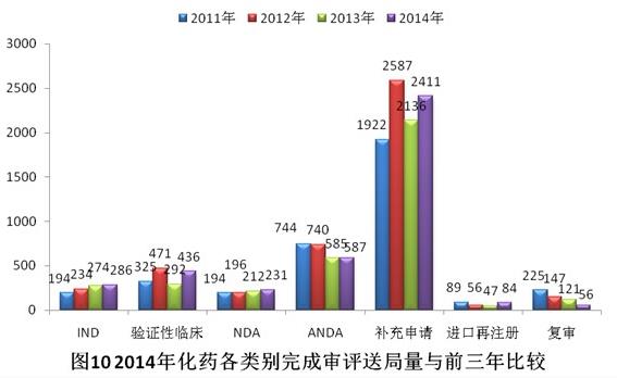 有明确审评结论的注册申请中,建议批准的2960个,建议不批准的842个,总体不批准率为22.1%。与2013年比较,2014年化药除复审外各类别完成审评送局量均有所增加。2014年化药各类别完成审评送局量与前三年比较情况见图10