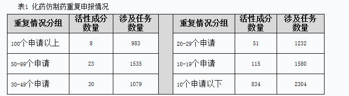 化药ANDA申请和验证性临床申请存在大量重复申报情况。截至2014年底,待审的化药ANDA申请共8713个,占待审任务总量的46.9%,涉及活性成分1061个。重复申报较为严重的有112个活性成分(相同活性成分品种待审任务20个以上),涉及待审任务4829个,占化药ANDA总待审任务量的55.4%。其中相同活性成分品种待审任务超过100个的活性成分有:埃索美拉唑、阿托伐他汀钙、硫酸氢氯吡格雷、恩替卡韦、法舒地尔、头孢地尼、氨溴索、莫西沙星。具体见表1