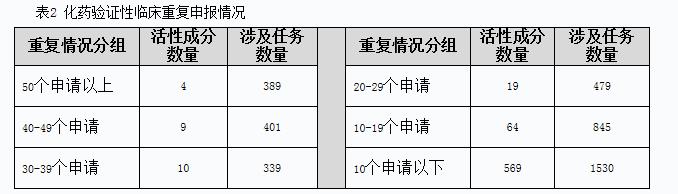 截至2014年底,待审的化药验证性临床申请共3983个,占待审任务总量的21.4%,涉及活性成分675个。重复申报较为严重的有42个活性成分(相同活性成分品种待审任务20个以上),涉及待审任务1608个,占化药验证性临床待审任务总量的40.4%。其中相同活性成分品种待审任务超过50个的活性成分有:阿齐沙坦、罗氟司特、布洛芬(注射剂)、鲁拉西酮。具体见表2