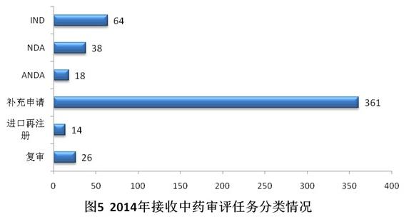2014年共接收中药注册申请521个,其中69.3%为补充申请。具体见图5