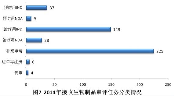 2014年共接收生物制品注册申请458个,其中补充申请占49.1%,治疗用生物制品IND32.5%。具体见图7