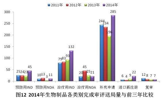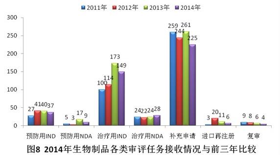 2013年相比,2014年生物制品除治疗用NDA外,其他各类审评任务接收量均有所下降。具体见图8
