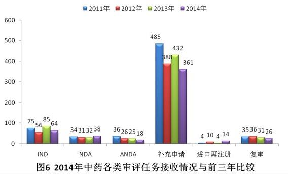 有明确审评结论的注册申请中,建议批准的200个,建议不批准的300个,总体不批准率为52.5%2014年中药各类别完成审评送局量与前三年比较情况见图11