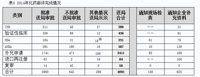 2014年化药完成审评并呈送总局审批的注册申请共4091个,另有完成审评通知现场检查的注册申请156个,完成审评通知企业补充资料的注册申请625个。具体情况见表5