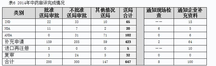 2014年中药完成审评并呈送总局审批的注册申请共647个,另有完成审评已通知现场检查的注册申请8个,完成审评通知企业补充资料的注册申请100个。具体情况见表6