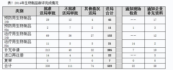2014年完成生物制品审评并呈送总局审批的注册申请共523个,另有完成审评已通知现场检查的注册申请22个,完成审评通知企业补充资料的注册申请58个。具体情况见表7
