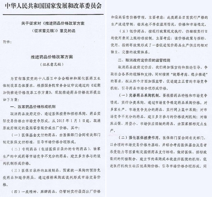据悉2014年11月25日,国家发改委向8个行业协会下发了关于征求对《推进药品价格改革方案(征求意见稿)》意见的函。在此之前发改委药品价改方案已经多方意见征求,征求对象包括地方物价系统、卫计委及人社部等相关政府部门。